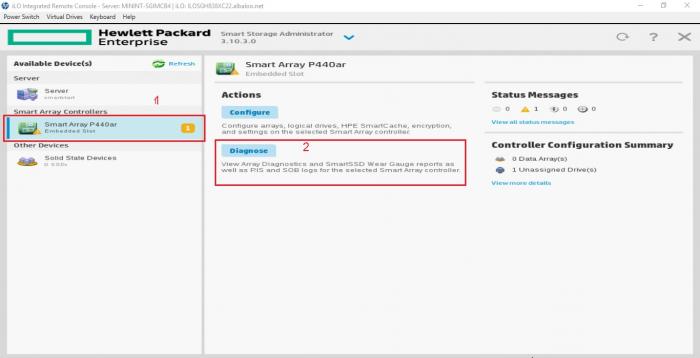 سپس بعد از چند ثانیه وارد مرحله بعد می شویم، در این مرحله در قسمت سمت چپ وارد Smart Array Controllers شده و با توجه به کارت Raid که ما اینجا مدل Smart array P 440ar داریم را انتخاب می کنیم و در سمت راست در قسمت Actions بر روی Diagnose کلیک کرده و وارد آن می شویم .